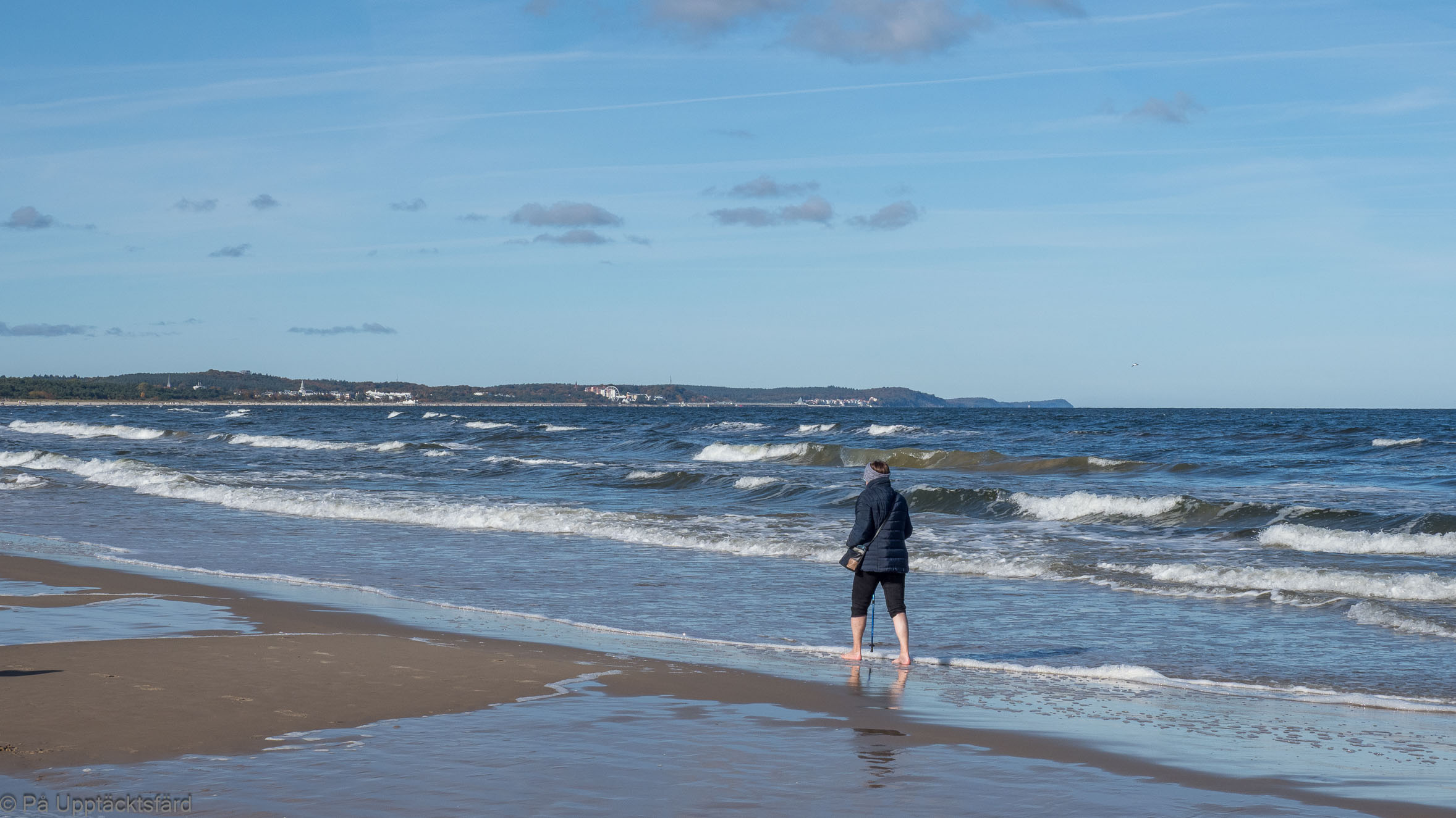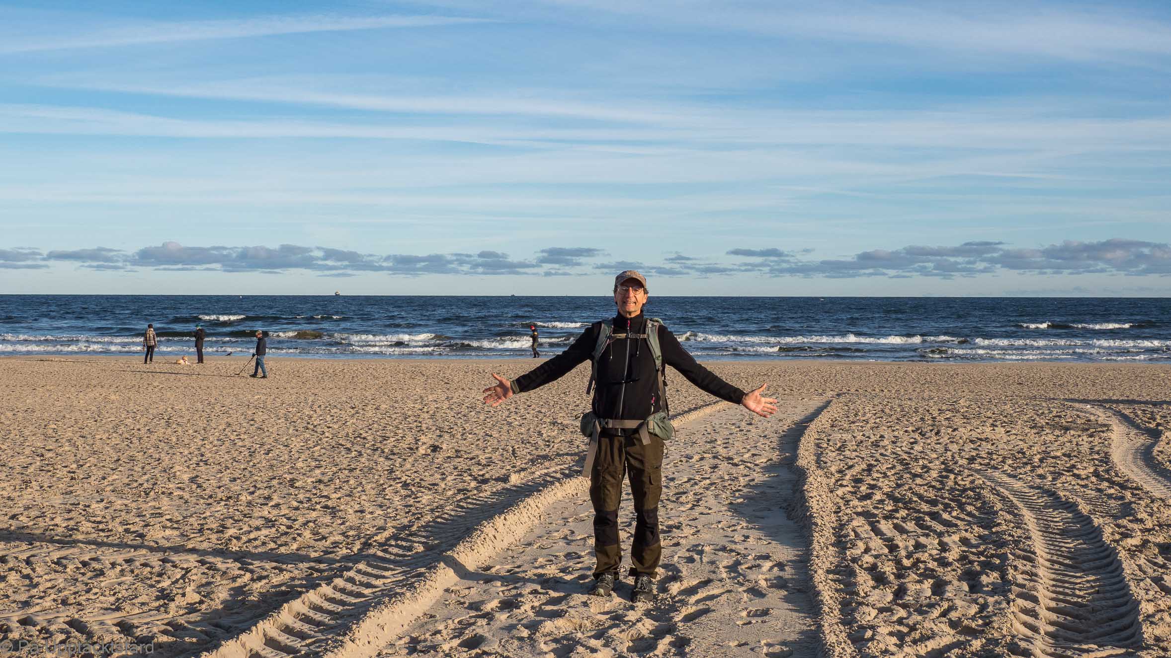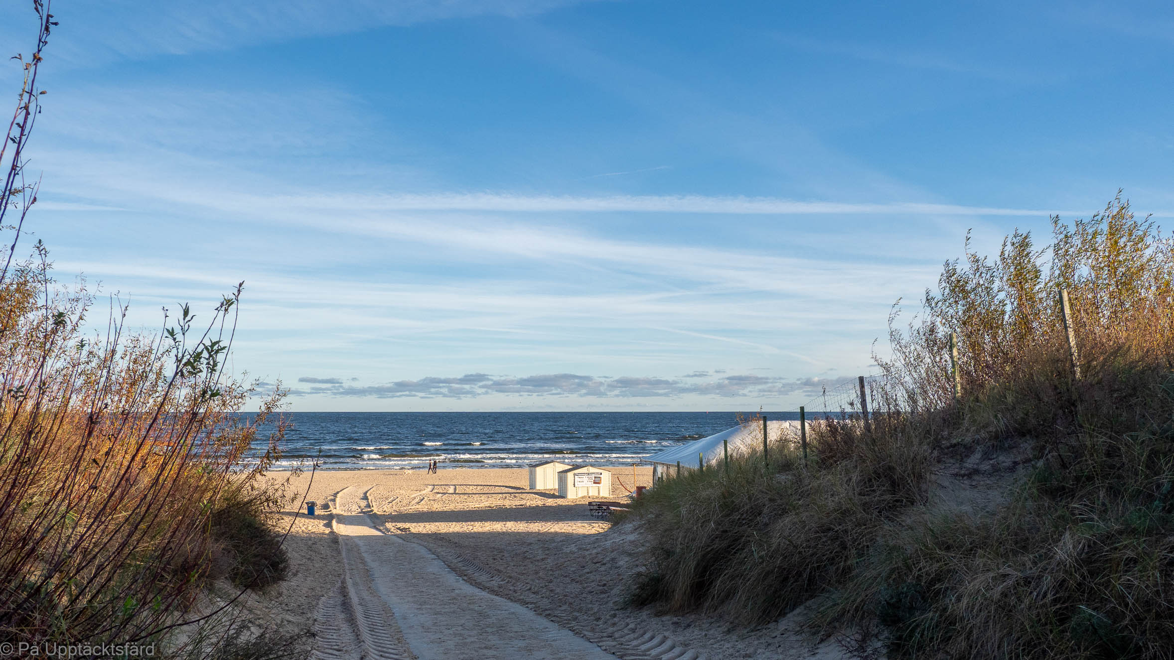 Visst är det något särskilt med att vistas på en sandstrand när solen skiner och ljuset flödar från hav och sand så man nästan bländas av lycka. Det känns inte mindre märkvärdigt i mitten av oktober. För det märks, folk omkring oss är glada. Barn bygger sandslott som mitt på sommaren, människor flanerar eller har det skönt vid de öppna kaféerna på stranden. Folk i alla åldrar är glada och livsbejakande. Det påverkar även oss under strövtåget på denna härliga strand, med havsbrus i öronen och med sanddyner på landsidan.