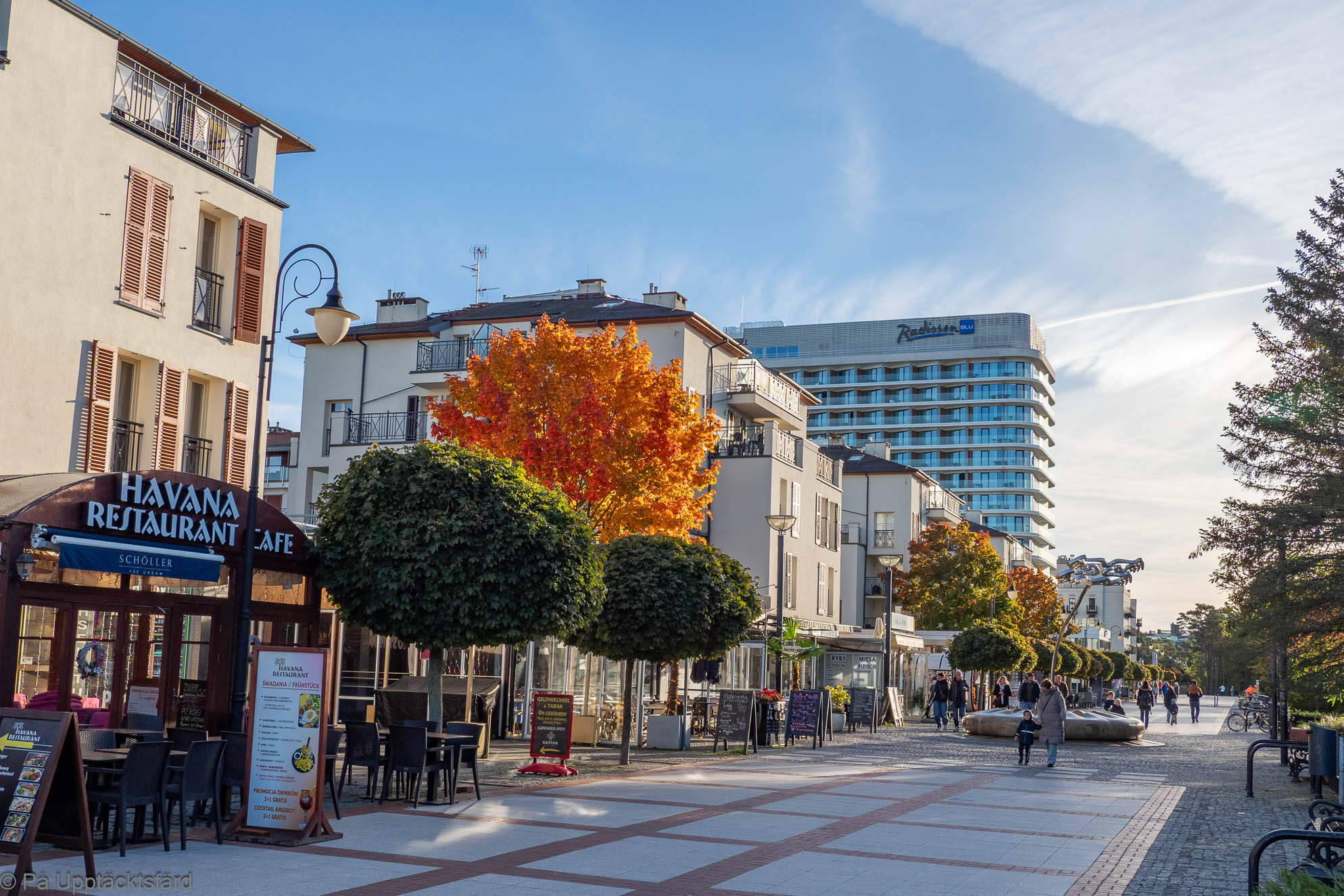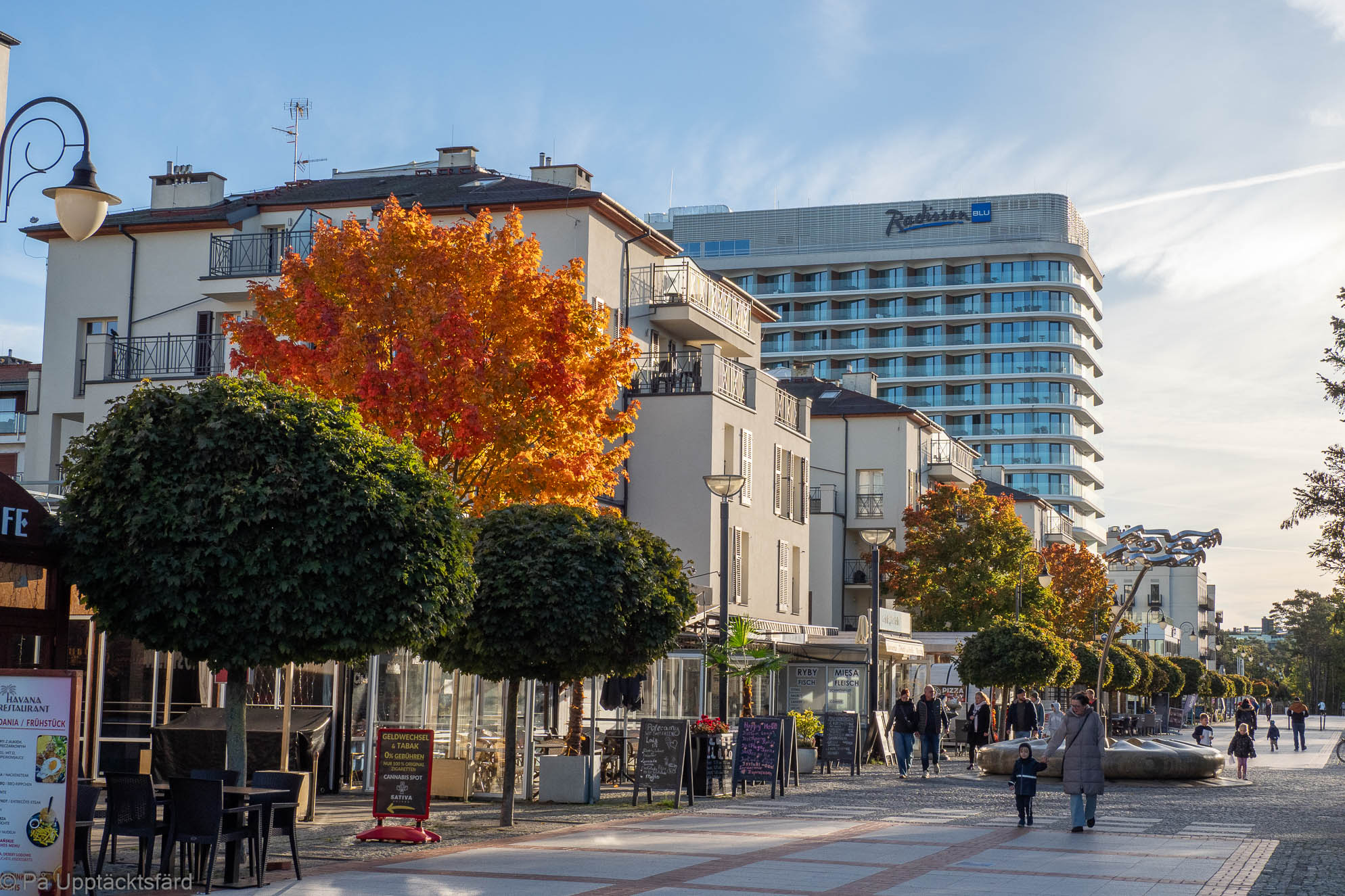 Nu på förmiddagen är det fortfarande glest mellan besökarna på den breda promenaden, på uteserveringarna, i turistbutikerna och på bänkarna. Alltså kan vi i godan ro betrakta promenadens fina blommor, fontänerna och Muszla Koncertowa, ett måste i alla badorter med ambitioner – en plats för parkkonserter.