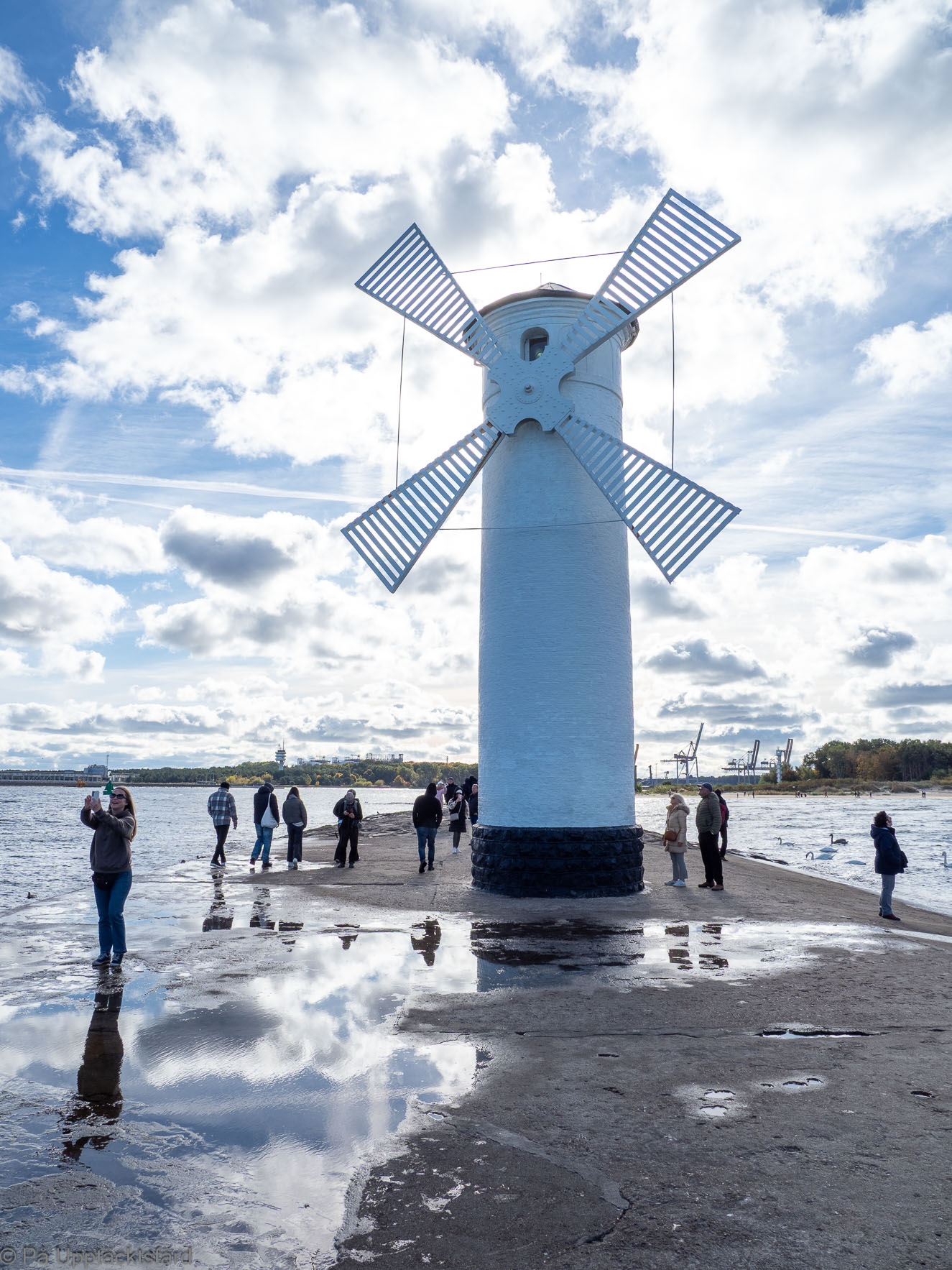 Härifrån pulsar vi på mjuk sand några meter för att speja över floden och båtarna. Och vi är inte ensamma om att vallfärda till punkten där floden Swine möter Östersjön intill landmärket med en väderkvarnformad fyr, Stawa Mlyny.