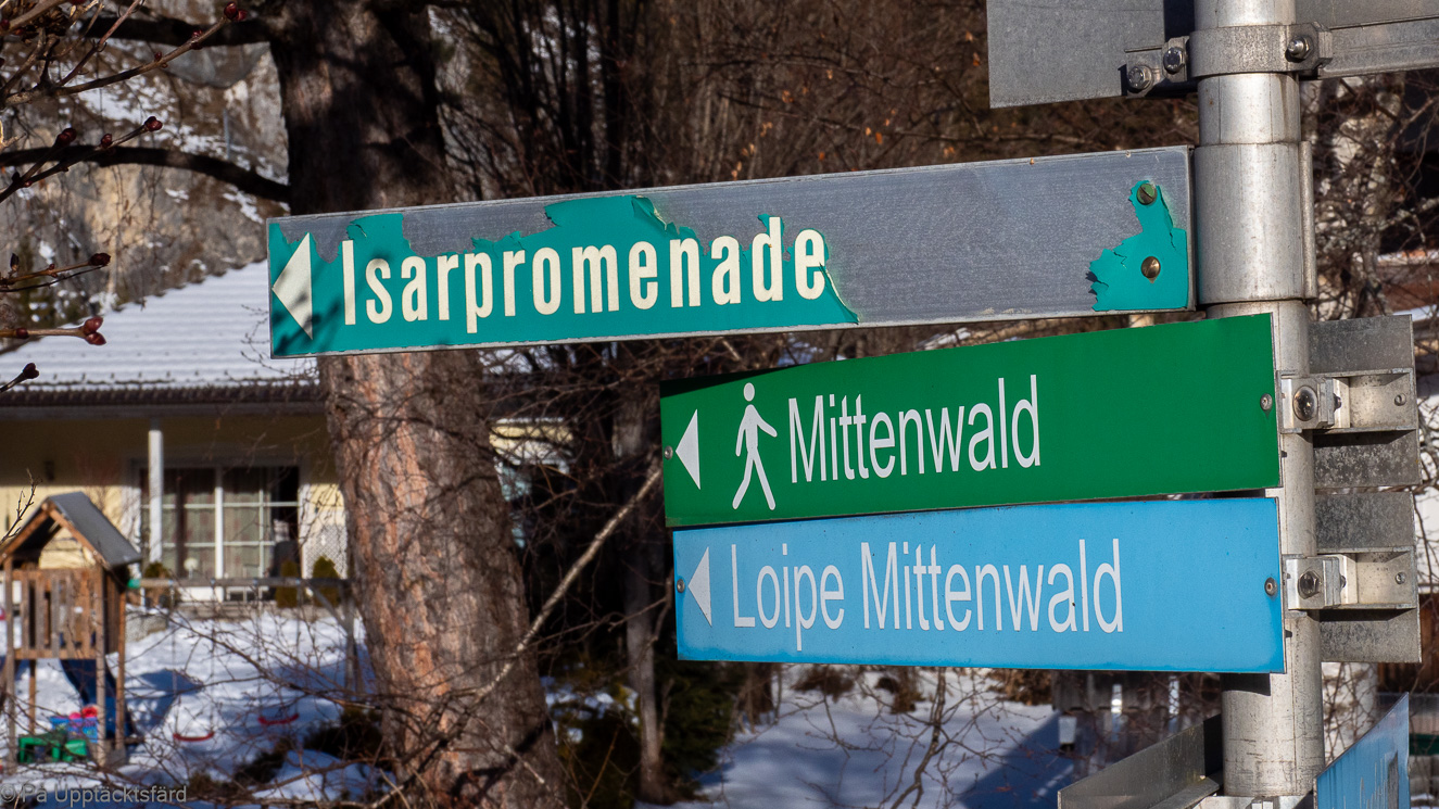Ännu är vi i Österrike och vi följer skylten mot Mittenwald över Riedboden. Och hux flux är vi i Tyskland, vilket framgår av skyltarna. Någon gränskontroll eller gränsmarkering är det inte tal om, i varje inte fall här och nu.