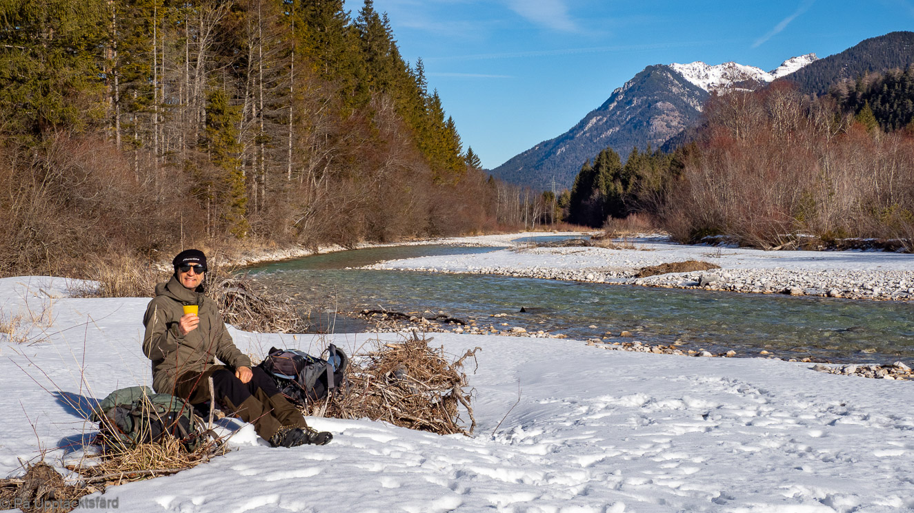 Efter Riedalm på 935 meter över havet kan vi inte låta bli en fikapaus. Platsen på ett snöfält intill en strömmande flod och ett väldigt bergmassiv är oemotståndligt. Vi slår oss ner på en stock och förser oss med kaffe och nötter ur matsäcken. Solen strålar, bländar, förtrollar, värmer.