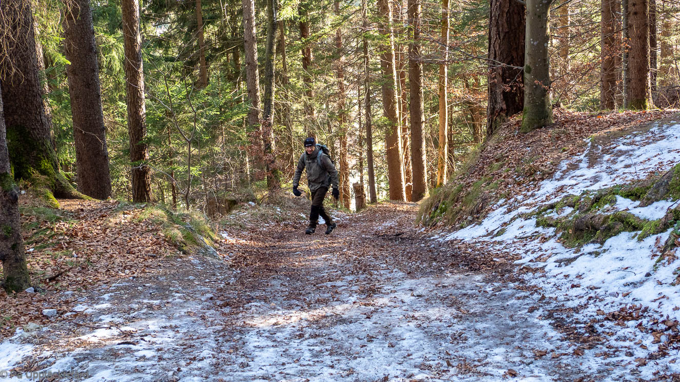 Härifrån är det blott 100 meter till en trång ravin, som verkar vara en turistattraktion på sommaren. Men nu på vintern är vägen dit spärrad. Här är bara vi. Och emellanåt bergen skymtande mellan träden.