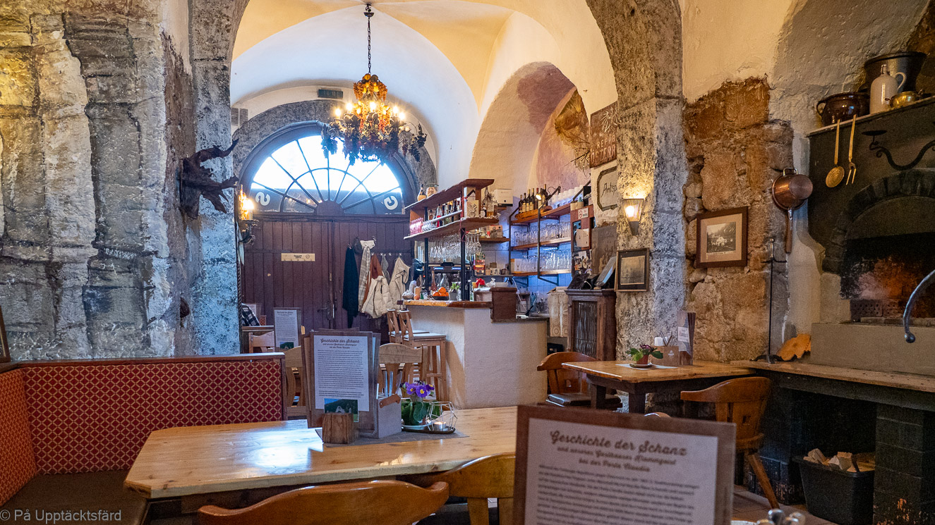 Vi sätter oss till bords i den vackra och historiska lokalen med välvt tak. Ut från köket kommer en lokal variant av Käsespätzle, vilket här heter Kasspatzn (smält ost, lök och makaroner) och Klammgeistteller (schnitzel med ost och skinka ovanpå, två knödlar och sås). Vi låter oss väl smaka av dessa närande regionala rätter medan det sprakar från den öppna spisen bredvid. Det känns varmt, både i och utanför magen. Notan går på knapp 400 kronor inklusive kolsyrat vatten (2026).